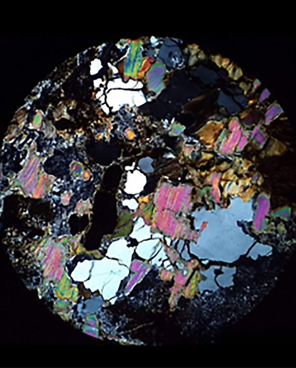 “Beauty begets beauty” at Ankida, both in the ground and above it. Soil plays a predominant role in the structure of grapes, their vines and ultimately the wines. This slide is a microscopic slice of our vineyard soil that feeds the vines. Formed for over 600,000 years as part of the Appalachian Mountains, the second oldest mountain chain on the planet, this soil is a testament to nature's enduring power and the impact it has on the wines we craft. This ancient, weathered igneous rock of charnockite granite contains a complexity of quartz, pyroxene, feldspar converting to clay and other minerals too numerous to mention here.